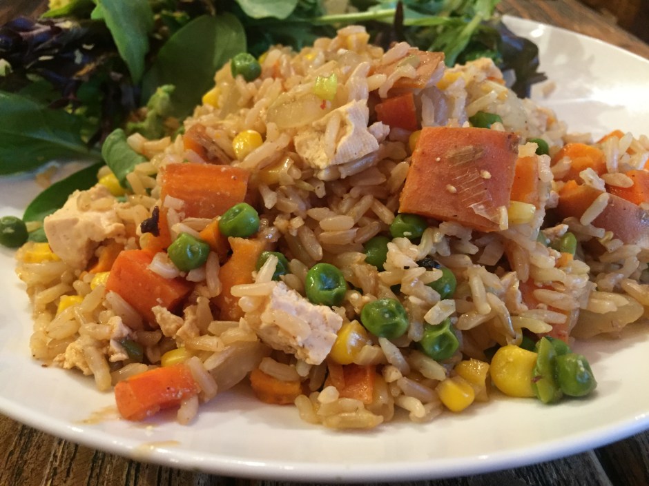 This is a never fail, throw any type of veggies in and it will still turn out great recipe. It works best with cold, leftover cooked rice. Recipe adapted from Thug Kitchen Cookbook.